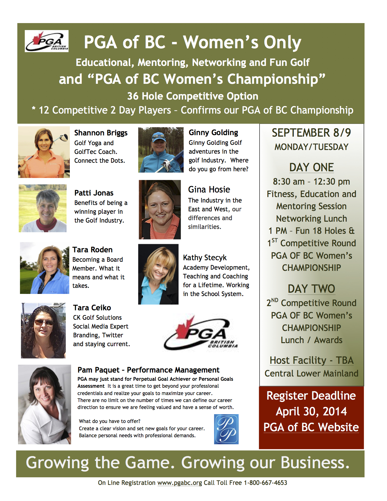 We are please to be able to offer this new opportunity for our PGA of BC Women Golf Professionals to meet up for education, mentoring, networking and golf… both for either one day of fun golf or two day 36 hole competitive golf. We are dedicated to grow the game and the golf industry 🙂