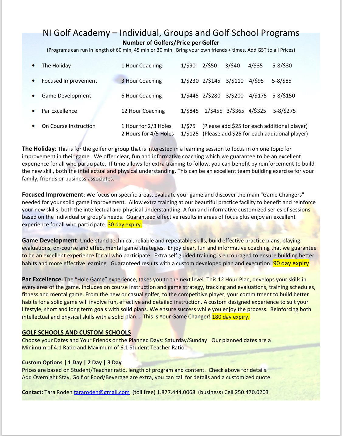 Understand technical, reliable and repeatable skills, build effective practice plans, playing evaluations, on‐course and effect mental game strategies. Enjoy clear, fun and informative coaching that we guarantee to be an excellent experience for all who participate. Extra self‐guided training is encouraged to ensure building better habits and more effective learning. Guaranteed results with a custom developed plan and execution.